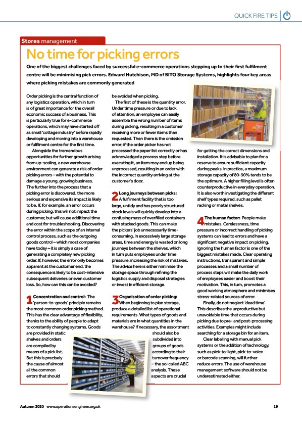 centre will be minimising pick errors. Edward Hutchison, MD of BITO Storage Systems, highlights four key areas